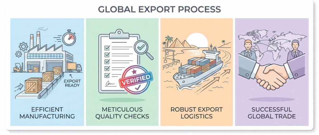 • Avoid export complexity — we manage documentation, inspection, freight (sea/air), customs clearance, and delivery.
